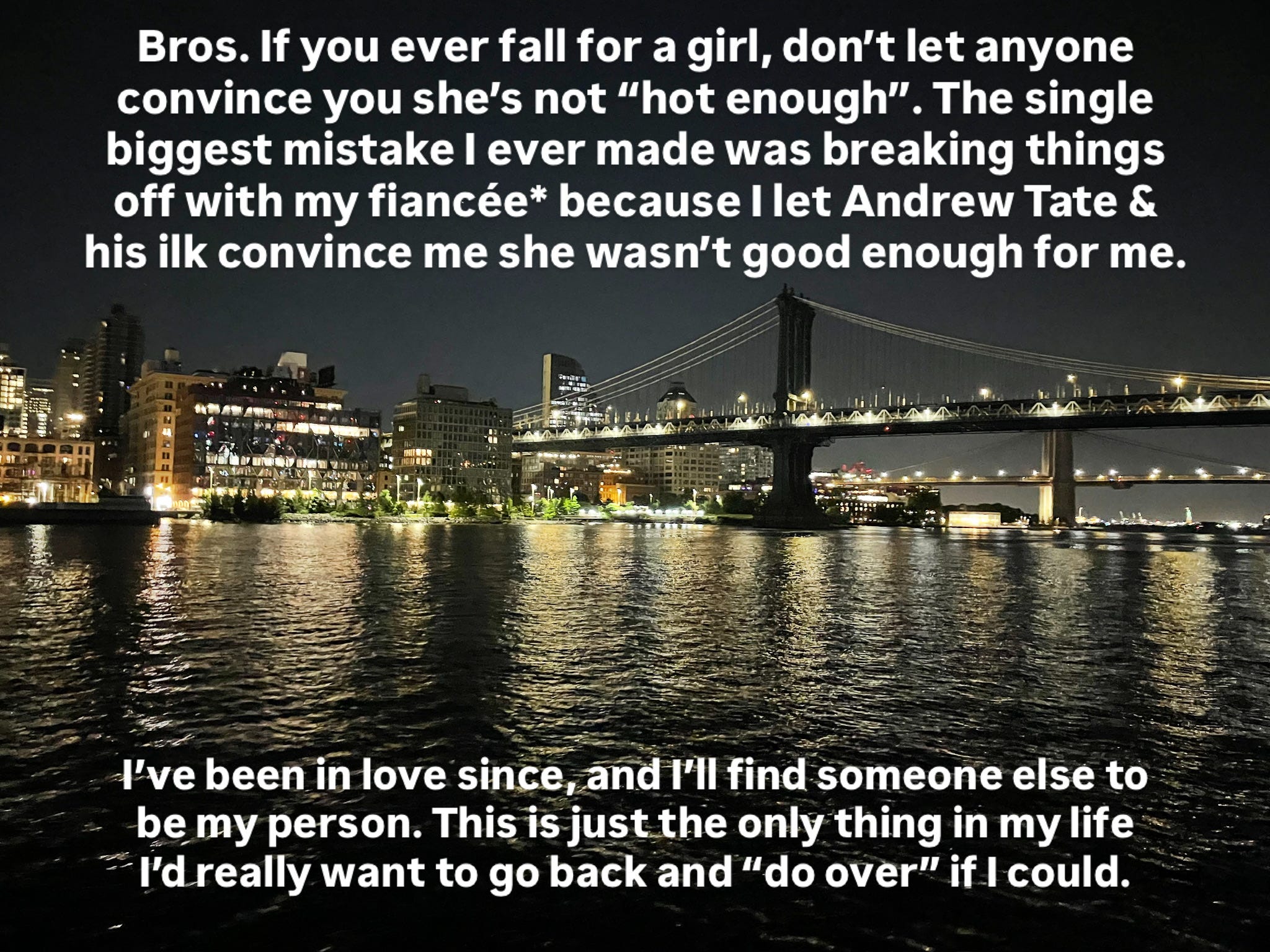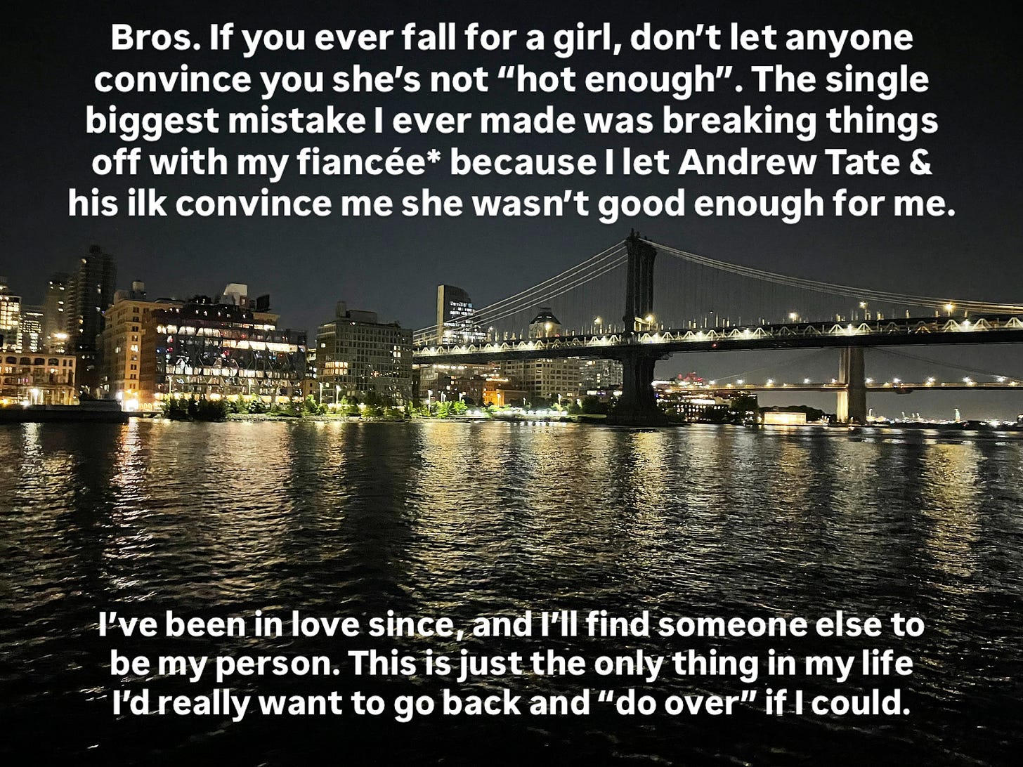 Our engagement was short, pathetic, and shameful (for me). I loved her dearly, but I allowed Andrew Tate and his “manosphere” ilk talk me out of committing to this marvelous woman, simply because she wasn’t as conventionally beautiful as one of the countless models I saw out and about in New York City, where we lived at the time.